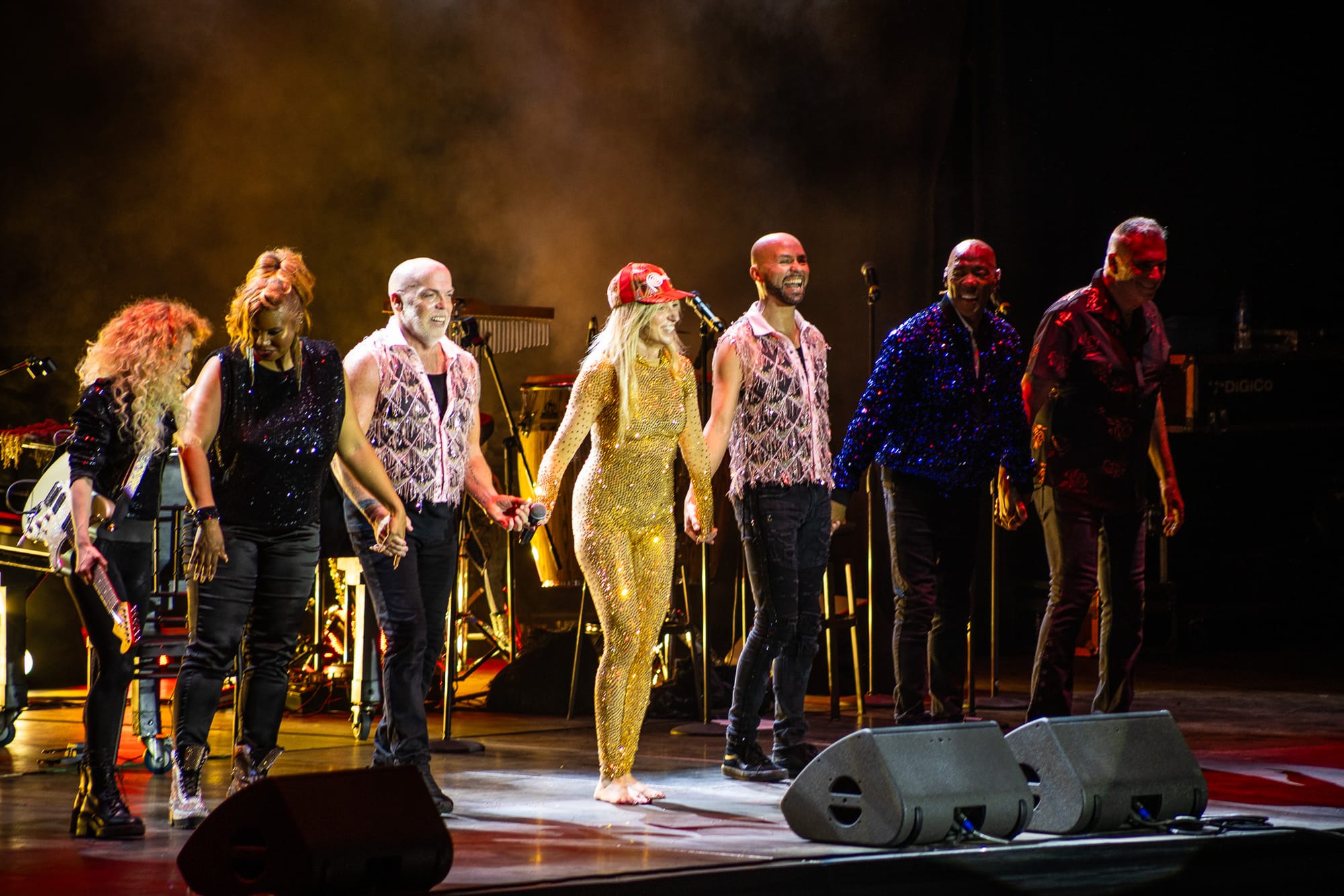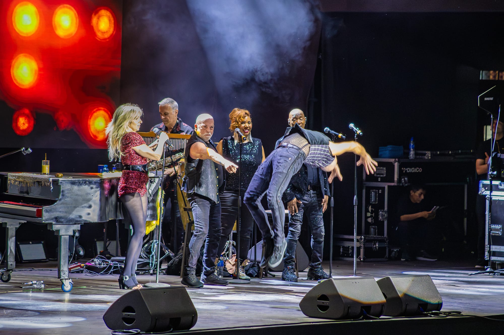 El cierre de la canción volvió al escenario, donde músicos e invitados llenaron el recinto de entusiasmo contagioso. La intensidad no disminuía: el show avanzaba con arreglos dinámicos, mezclando éxitos clásicos con material más reciente.