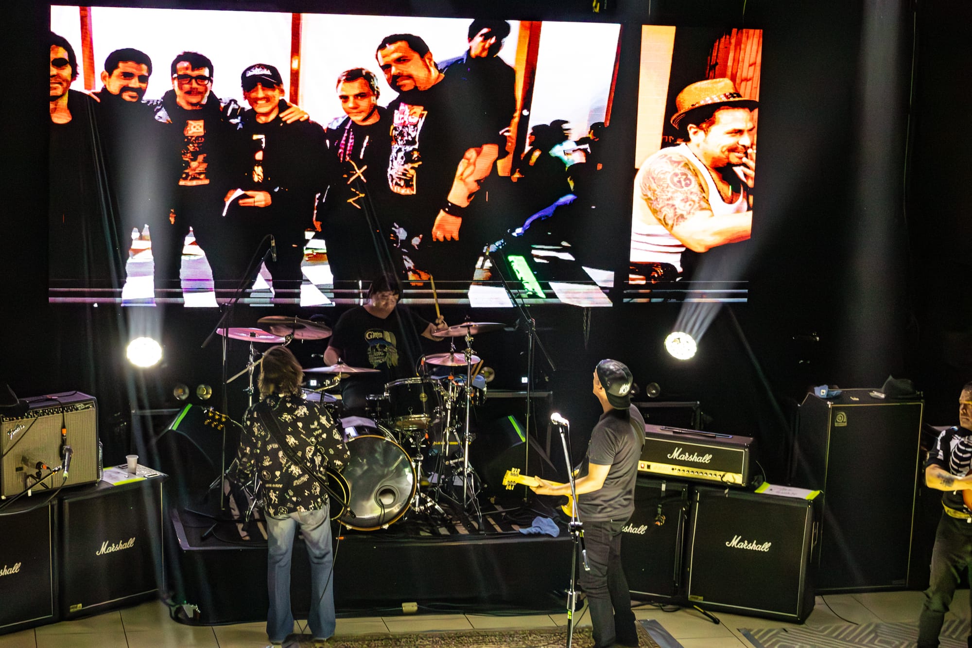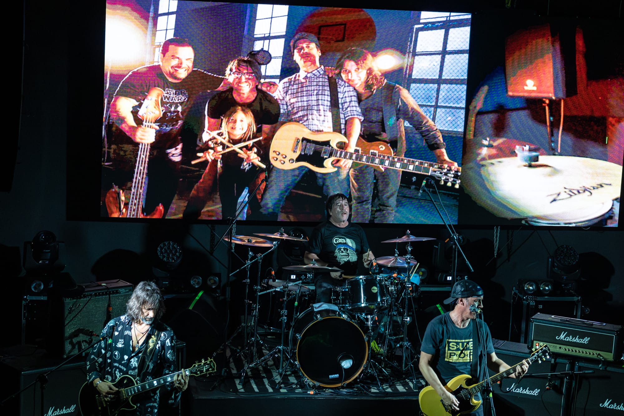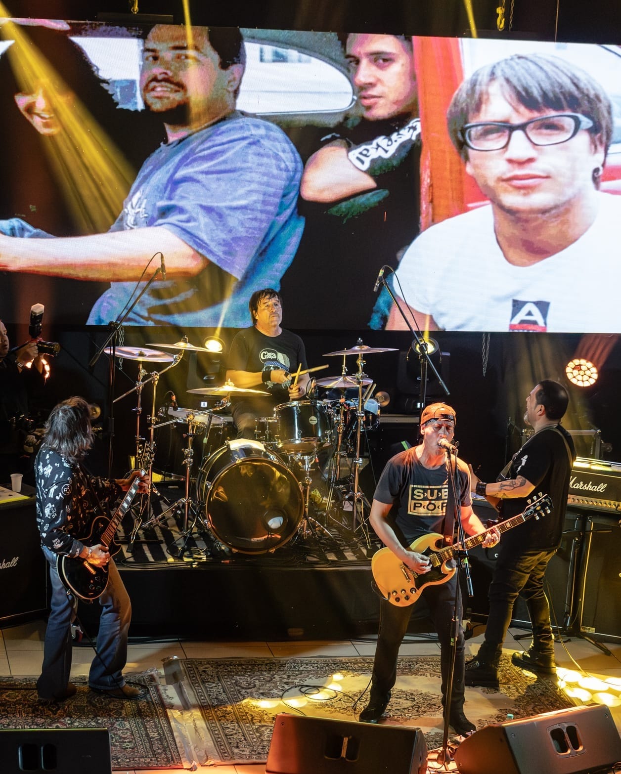 El final del concierto tuvo un tono particularmente emotivo. El riff de Pipe Villarán marcó el inicio de En Casa, mientras se proyectaban fotografías que recorrieron los distintos momentos de la banda. Flyers de conciertos, fotografías con amigos, noches en vivo.